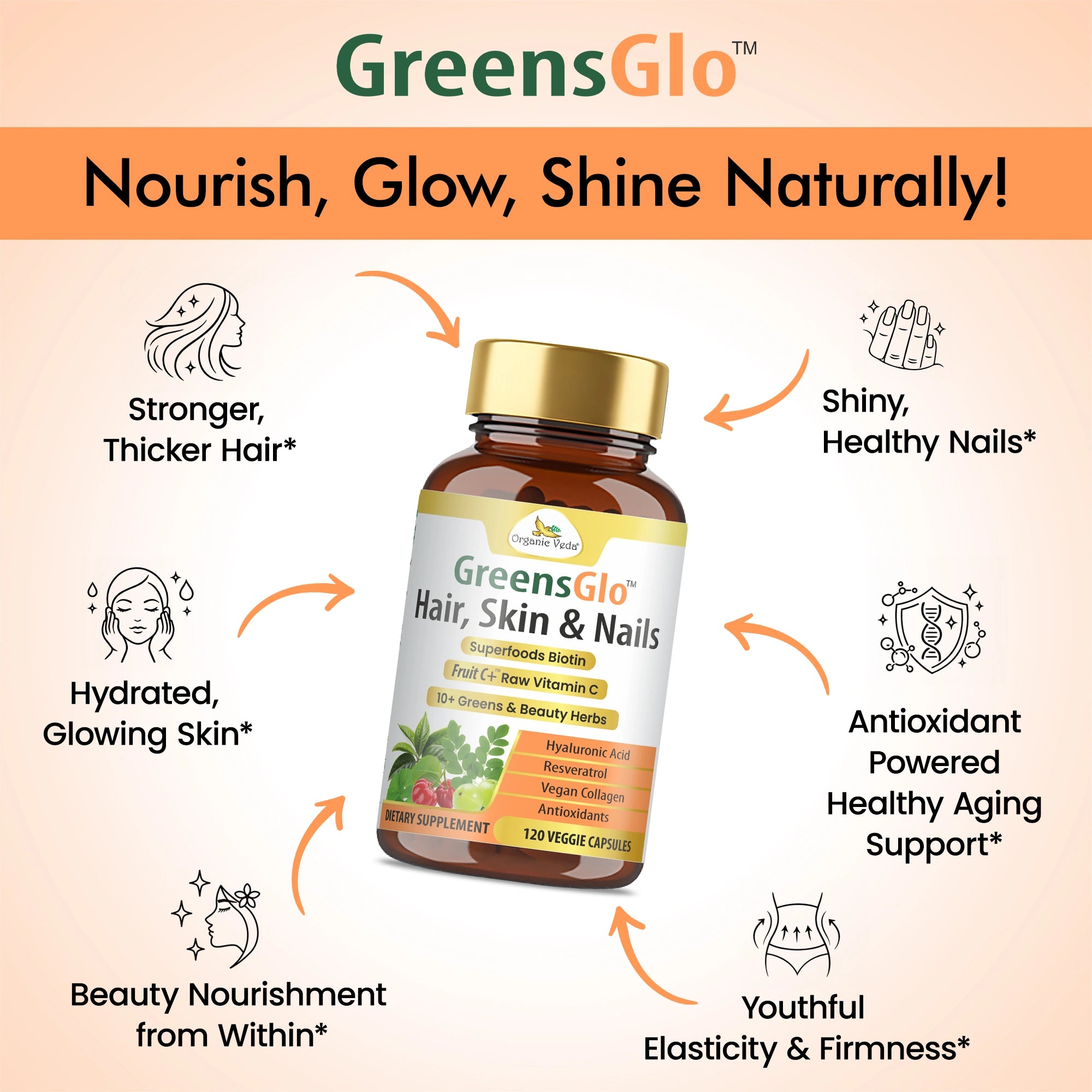 GreensGlo hair skin nails supplements with biotin capsules support beauty nutrition for skin glow, hair vitality, and nail strength in a vegan formula.