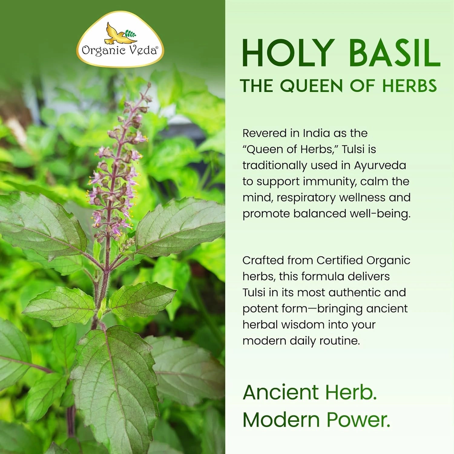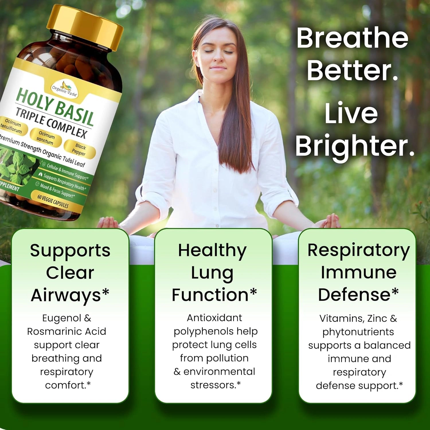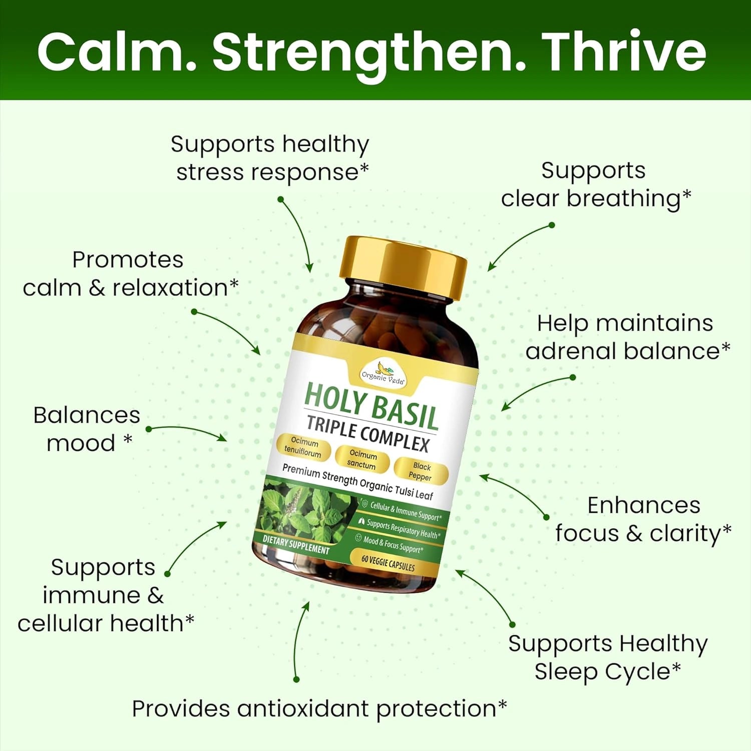 Organic Veda Holy Basil Triple Complex supports stress relief, respiratory health, and immune balance with a powerful blend of three Tulsi varieties and black pepper extract.