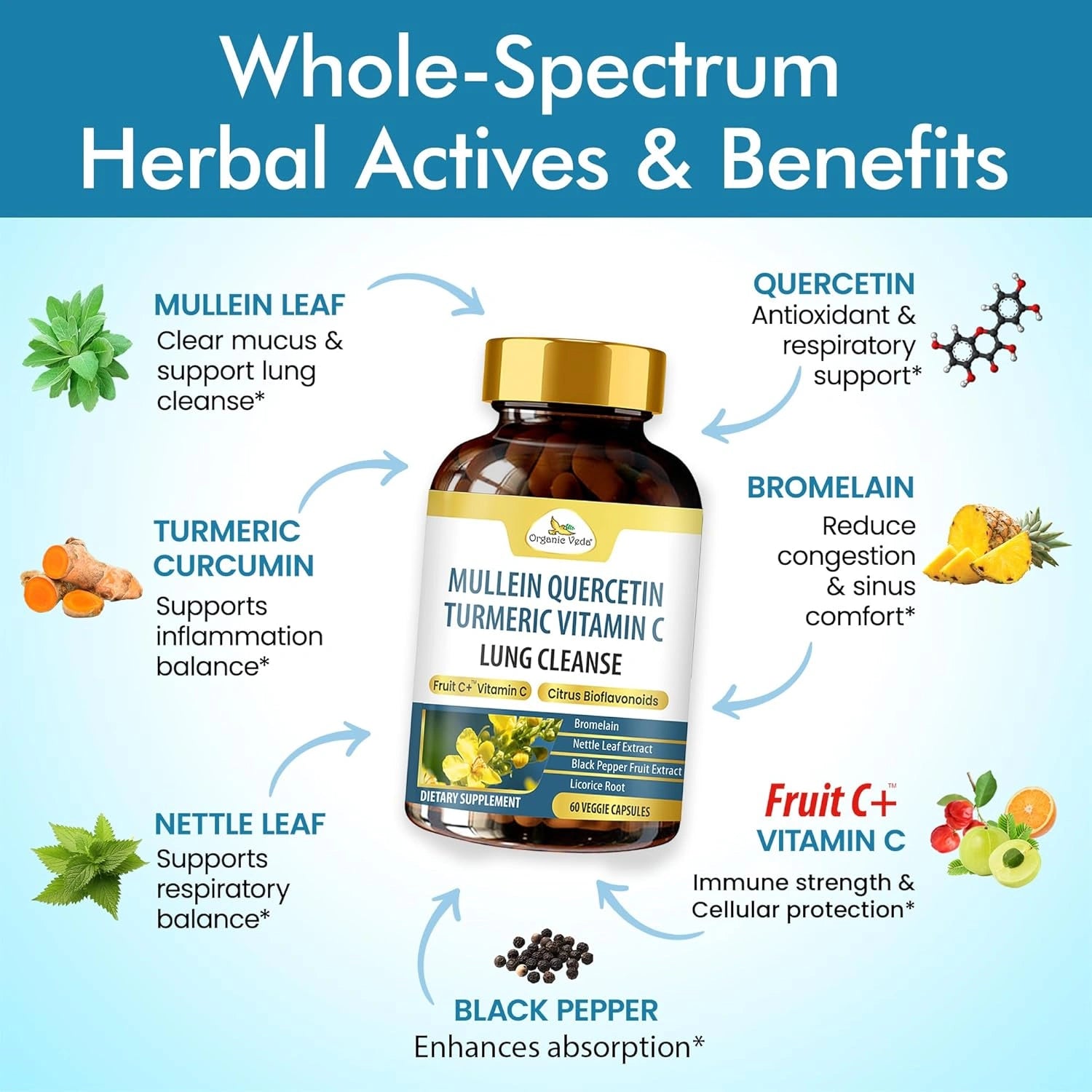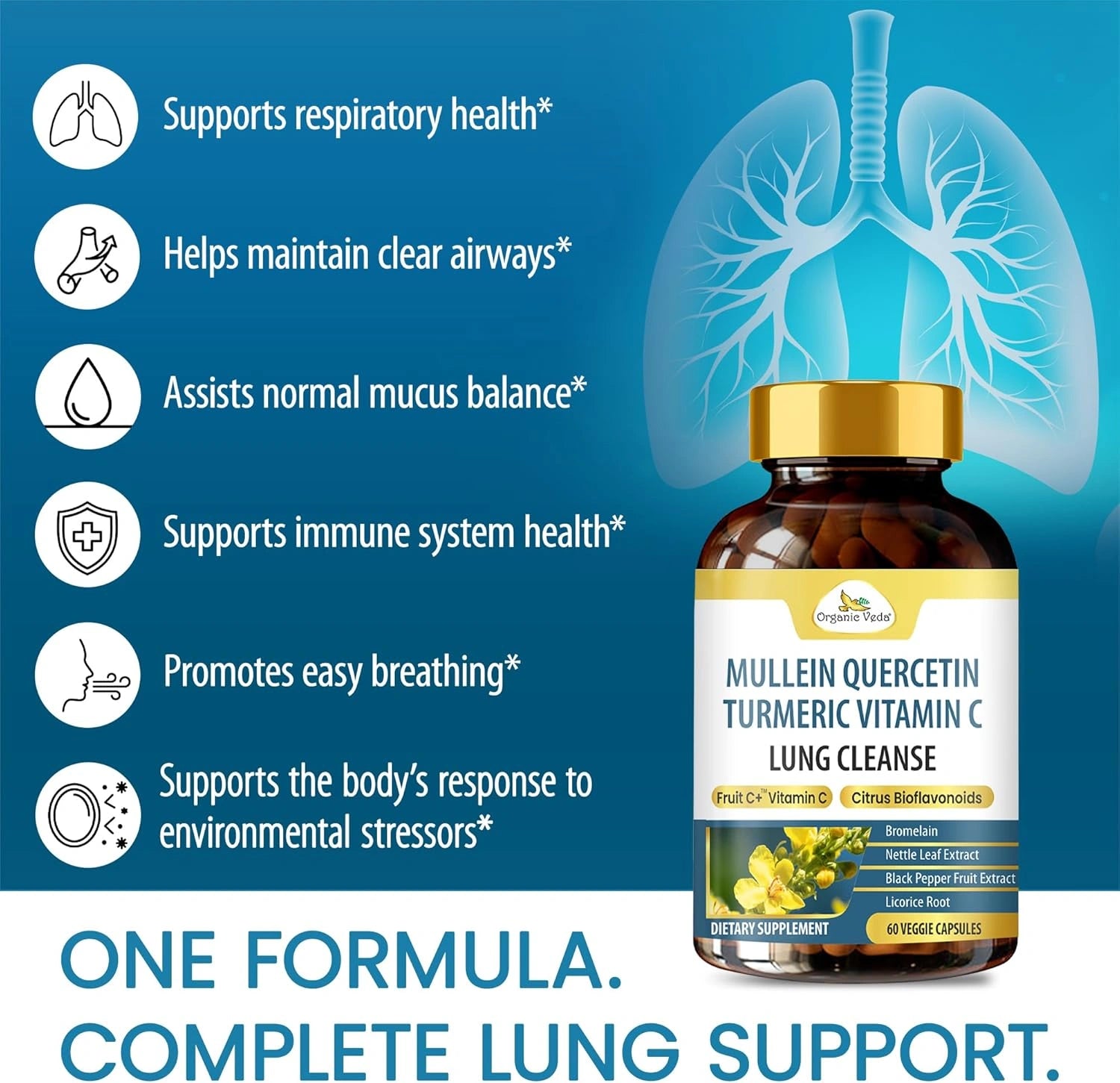 Vegan respiratory support capsules with Mullein, Quercetin, Bromelain, and Ayurvedic herbs to promote clear breathing, lung comfort, and daily immune wellness.